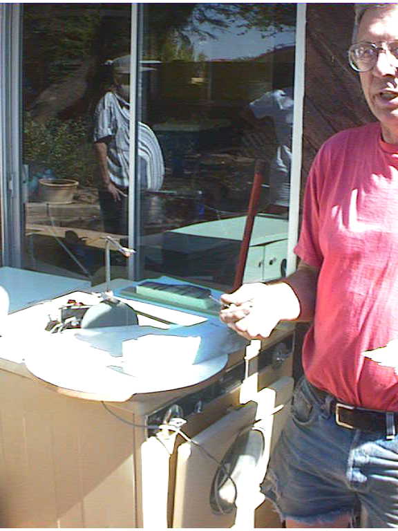 Ted likes making his patterns from Styrofoam. He is indeed as Paul Pierce so eloquently described, "the McGuyver of metalworking and machining" Here Ted is showing off his hot wire foam carver. Simply its a frame holding a solid strand of wire, connected to an old model train transformer to regulate the heat. It slices through the foam like butterRight; Here Ted shows another hot wire Styrofoam cutter. This is for cutting slabs of foam into thinner sheets.