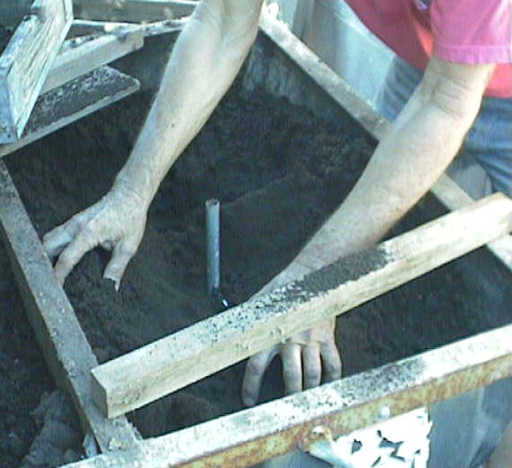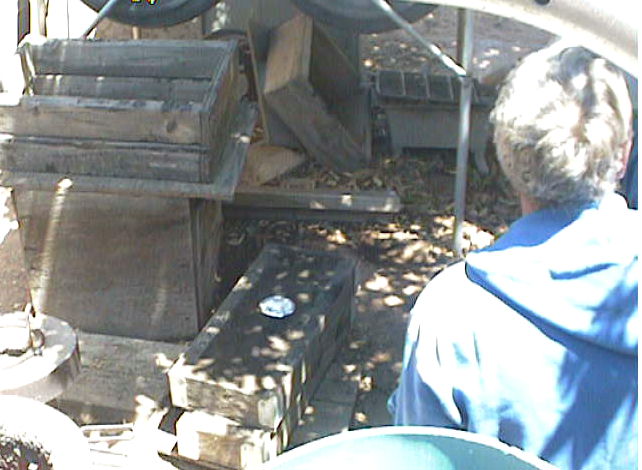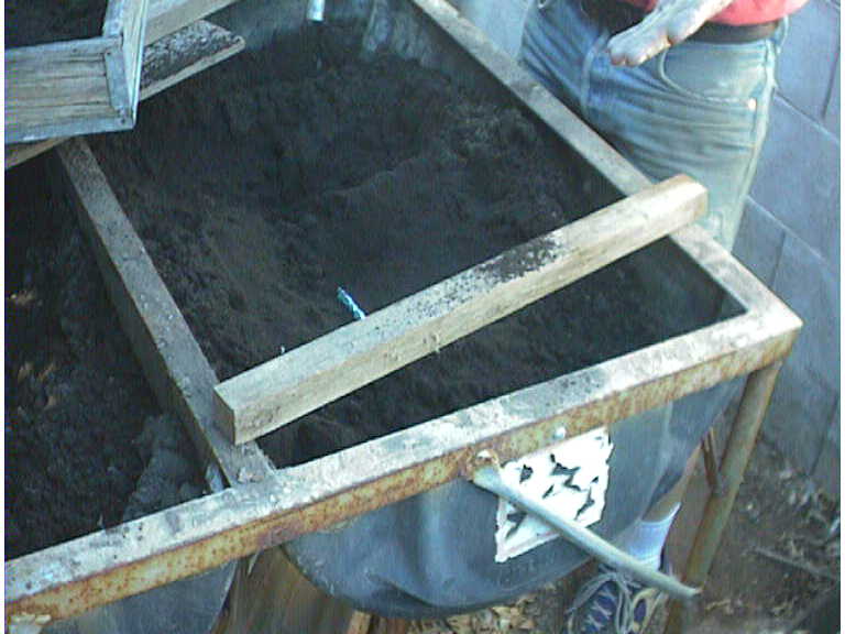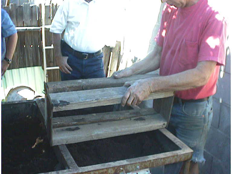 Interestingly enough, Ted used River silt/sand from the local Salt River bed. With a little water mixed in it holds its shape quite well and is very fine. Here he is showing where he keeps it and mixes it. He keeps it in this container, which are split plastic barrels supported on an angle iron stand. He mixes the water/sand one side, if too wet he'll draw dry material from the other side.