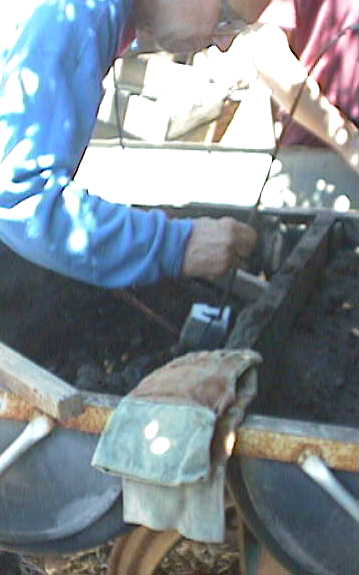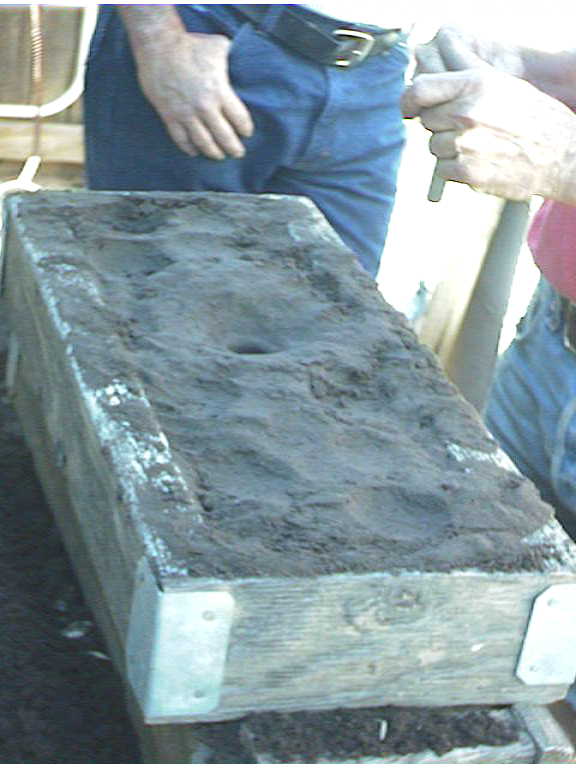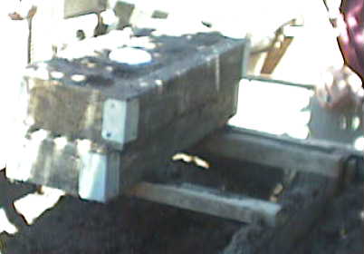 On the left picture, Ted is showing his "flasks" nothing more than 2x material and plywood. In the middle, Ted had laid the pattern (small blue line above the 2x2) in the bed of sand. He shook through a sieve a very fine layer of sand below over and around the pattern then added a small piece of electrical conduit and packed the rest of the material around the form. The conduit goes all the way to the pattern. This is where the molten aluminum is to be poured. Since the pattern is foam, there is no need to split a flask. So the entire process could be done here. Ted did show us the typical way of casting however: