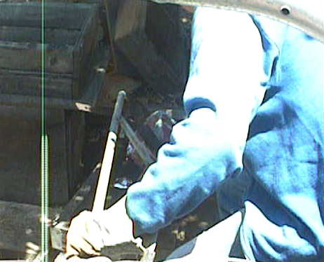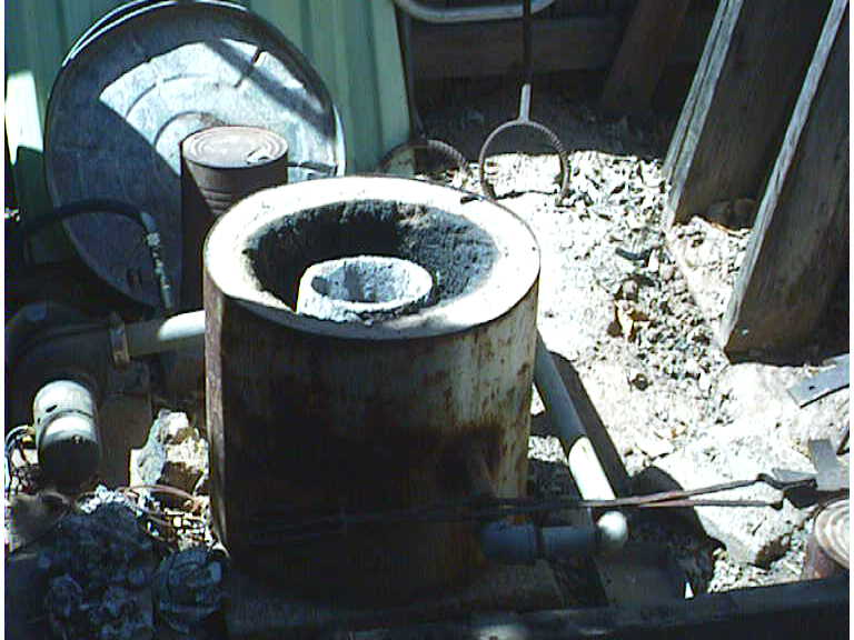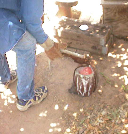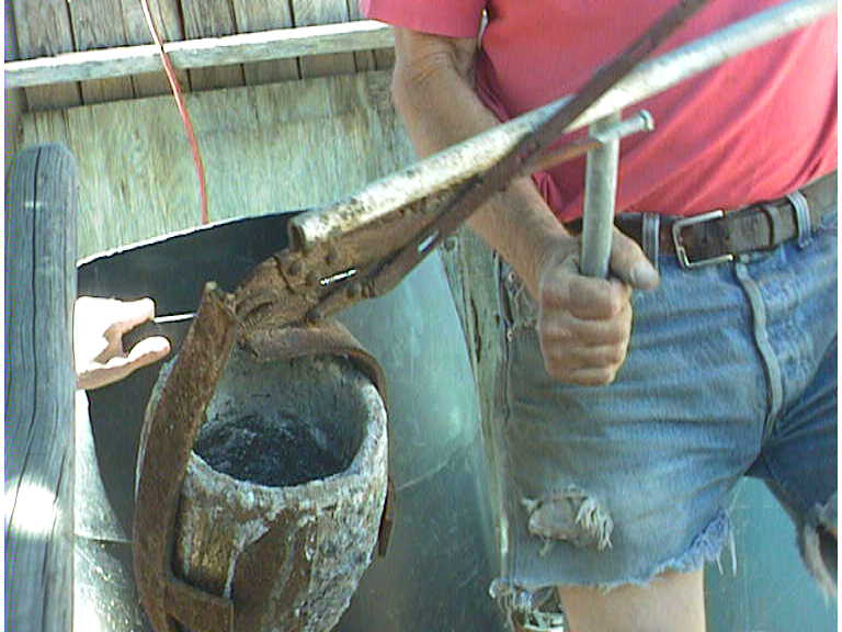 Left, you can see the crucible that Ted uses and one of his clever inventions, he used a pair of vise grips, made a handle with a T to grip and pour the crucible without any contortionism! Way to go Ted! Middle pour in action, Right, just after the pour. (Note: TED DID CHANGE AND PREP FOR THE POUR!)