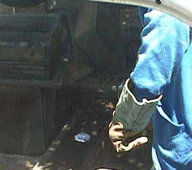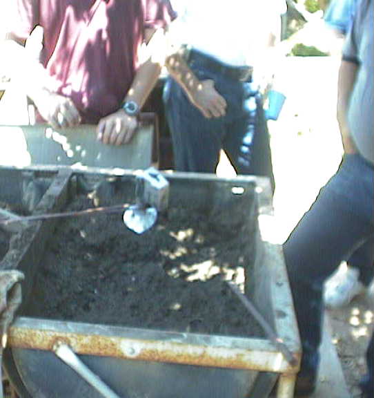 Left, picture after the pour, middle, Ted prepping to pour the extra aluminum into the sand, he made a depression in his sand bin to recover the excess. Right, he was about to shake out the sand to see our part