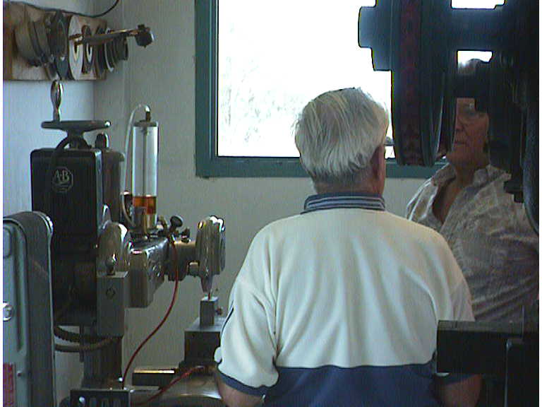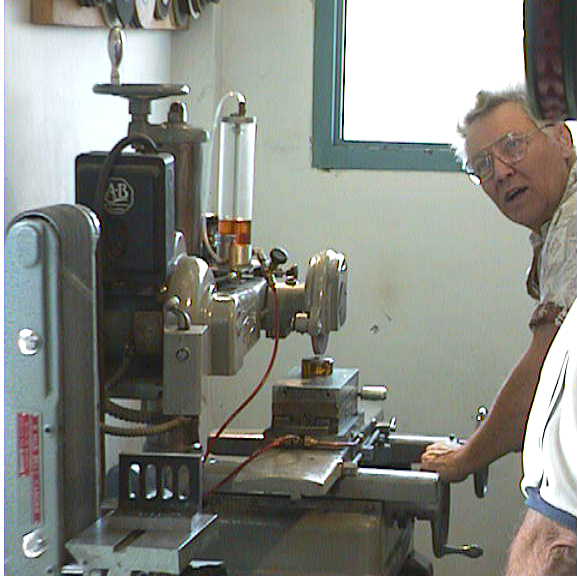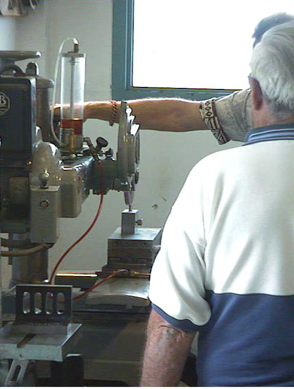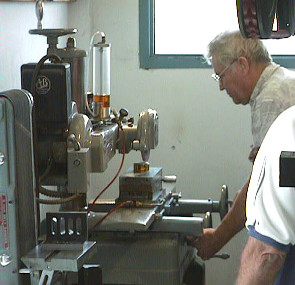 Alan, first gave us the "nickle" tour of his shop which included his woodworking machines and his metalworking machinery. Alan demonstrated his new "toy", a Hitachi VFD on his Index Mill. Tight space in his metalworking area but we all managed to squeeze in ok. Alan then took us to his nicely restored Rockwell Toolmaker surface grinder where he demonstrated its features, dressing the wheel and finally taking a cut. He had the rythym down pat. He also noted the importance of "sparking out" the wheel.