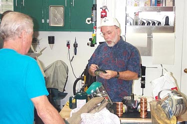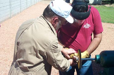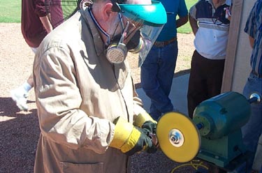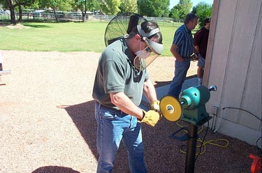 On September 14th 2002 Valley metal got together for a buffing and polishing demo. George Glines was kind enough to let us use his shop for this. Jim Riser came up from Tucson to teach the demo. Many things were covered. Among them were, Safety, compounds, buffing wheels, types of machines, how to buff and polish and LOTS of good food!! It was a great time, as these usualy are.
