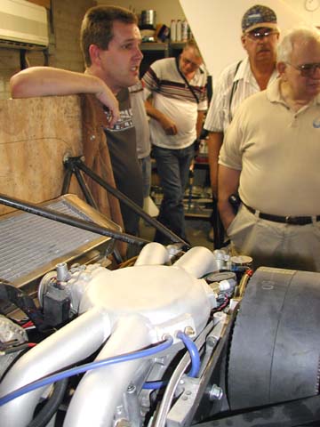 | Members attending 17; Tom H, Marty, Ron Z, Kevin, Kyle, Rex, Merlin, Alan, Chuck, Neil, Owen, Gene, Ron W, Rich, Glen, John our newest member Tom ? and of course Bart. Bart started by discussing the power plant and modifications to it. Bart took the time to answer questions on each system of the power plant. There were to many to list here but I will cover some of the highlights. There is a pump that runs off of the cam on one side of the engine to provide vaccum for the various systems. The reduction unit for the prop and it's durability or hours of run time. The turbo charger and the modifications for this application. Most notible was Bart's creative use of kitchenware in the intake manifold. The center section was fabricated from a aluminum pot which fit the application very well. It was mentioned by other members that this can be a good source aluminum. Bart then moved on to the fuselage and its construction. |
