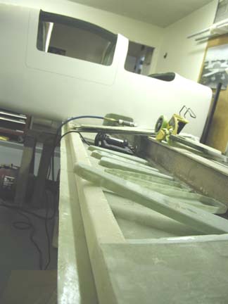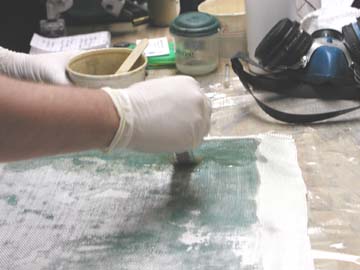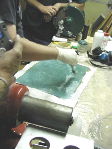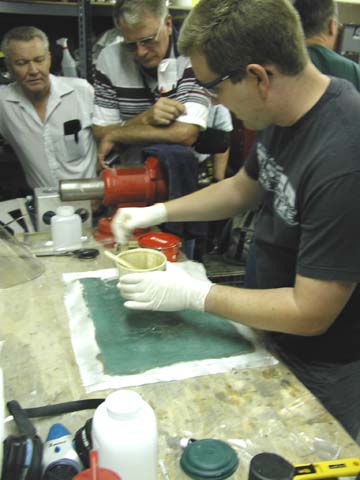 | Not the first photo but the second, Bart is judiciously removing air bubbles from the recently applied outer layer. Bubbles cause a loss of strength in the bond and can help cause delimitation. This of course is not a good thing! |