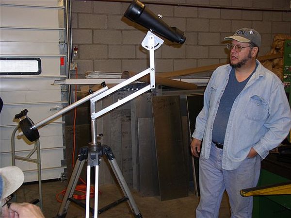 Beevo brought a newly completed parallelogram binocular mount he made for his wife Earla. The purchase of a larger pair of binoculars dictated some sort of support as these Celestron 25X100's weigh around 10 pounds! The benefits of the parallelogram mount is the height of the binoculars can be adjusted without the object moving in the field of view. The end of the rod has two 5lb barbell weights to counter balance the binoculars. All aluminum construction, it contained his first rotary table made part, the sector plate below the binoculars them selves.