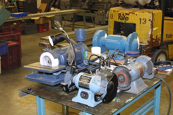 Members brought a variety of grinders and they were set up for use. The large machine to the left in this picture is a wet wheel tool grinder specifically made for tool bit sharpening. The blue grinder in the back is a low speed (1750 RPM) grinder of the type sold at woodworking stores for wood tool sharpening.