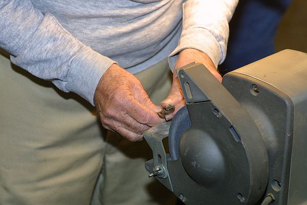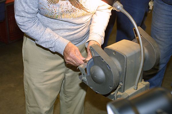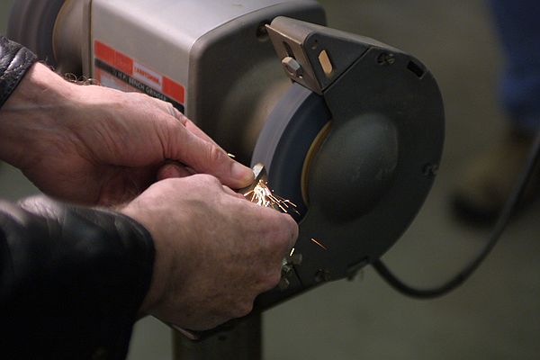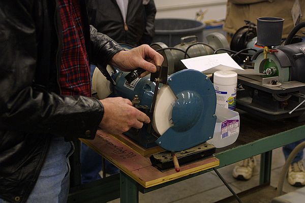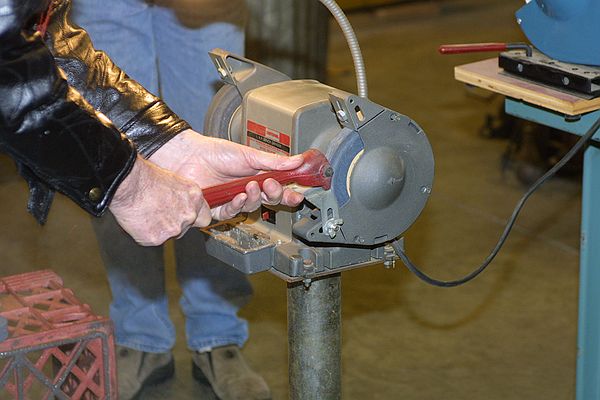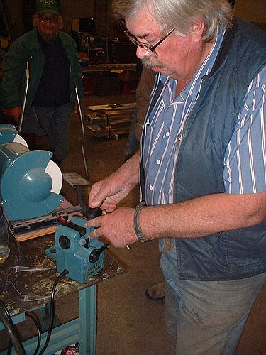 Nothing's better than a well dressed wheel. The use of the dresser was discussed. The dresser is doing it's job correctly when there are minimal sparks and a modest amount of dust coming off the wheel. It was pointed out that the feet on the dresser are actually there to hook over the tool rest to get the proper pressure and angle when dressing the wheel. Further discussion of the wheels centered on type and mounting. It was pointed out that the paper labels on the wheels must be used, the cushioning of the paper helps keep the wheel from fracturing. jerry Hine also made a good point that you should stand to the side of the wheel when starting up the grinder just in case the wheel has been damaged prior to it's use for the session. This is also a good practice at anytime, but especially when installing a new wheel.