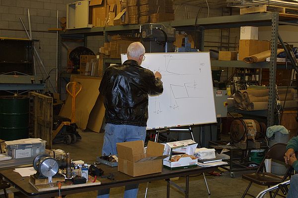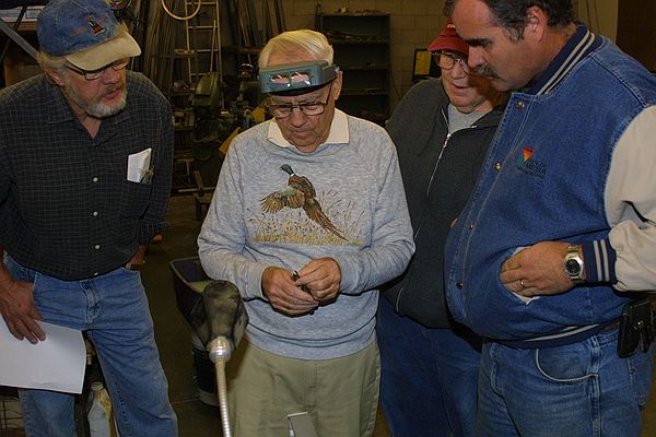 Bob Sanders held court on hand drill bit sharpening. Here members of the group listen to suggestions on relief angles, point shape and other details of the bit.