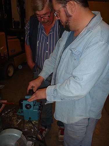 The Drill Doctor made by Darex was discussed. A number of members have had less than satisfactory results using it. Beevo (aka Bill VanOrden) happened to have his in the car and brought it in and offered to by any Drill Doctor for $25 cash. Since there were no takers he then demonstrated how to make it work and get good results. Other members tried their hand at sharpening drill bits on this tool. It was mentioned that the instructional video tape that comes with the tool must be viewed to be successful when using this little tool.