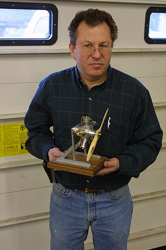 Robert Reisman brought a couple of engines he has made. The small hit & miss engine was made from castings obtained over the web. He ran it for a while before the meeting started. The 5 cylinder radial was made from metal stock using the series of articles in the Home Shop Machinist magazine. The little radial runs on compressed air and the only store bought part was the propeller. Robert took the time to explain that he built these to understand how they work and not just how to build them. It was stated that this was as fun as building them in the first place.