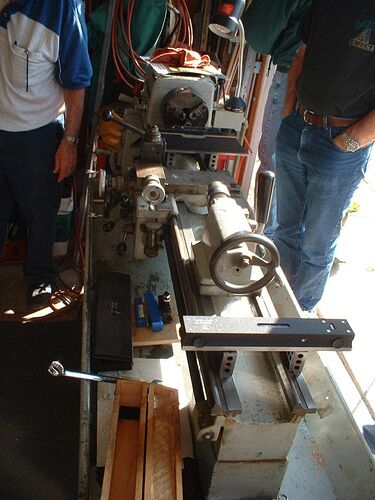 The level is then placed at the tail stock end of the bed and another reading is taken. The feet are then adjusted to make both readings the same. It is not critical that the lathe be leveled lengthwise as this will not affect the turning process. Deviations in the readings taken at either end, with the level placed crosswise to the bed, will result in twist of the bed and inaccurate turning. Having no les than 3 machinist's levels at the meeting we just placed two and did away with moving the level.