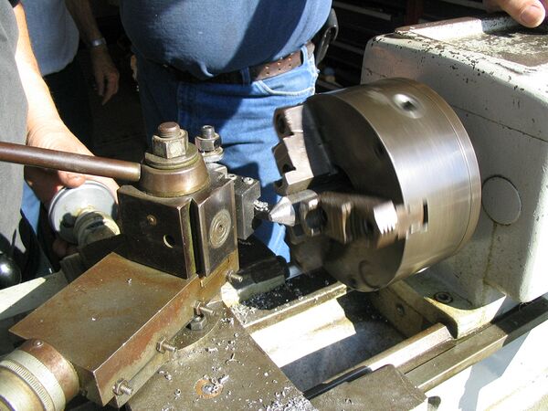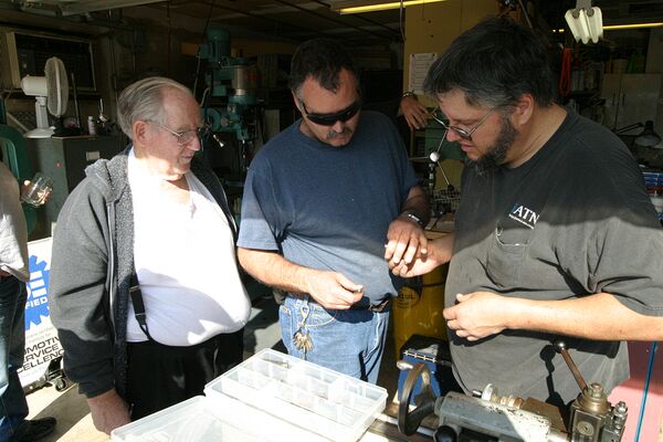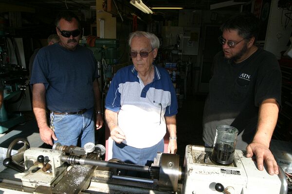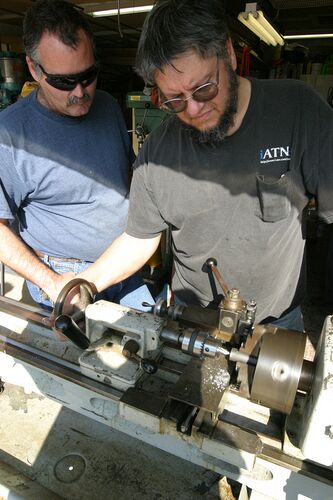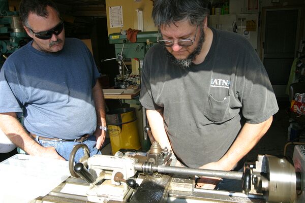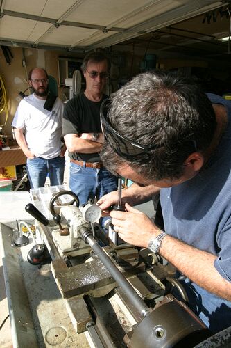 A brief intermission ensued while Marty and Beevo (with Tom Davis looking on) tried to find a decent tool bit to turn the test bar. Obviously Beevo didn't run home after the last meeting and sharpen all (or any) of his tool bits. A sort of decent bit was found and the turning re-commenced.
