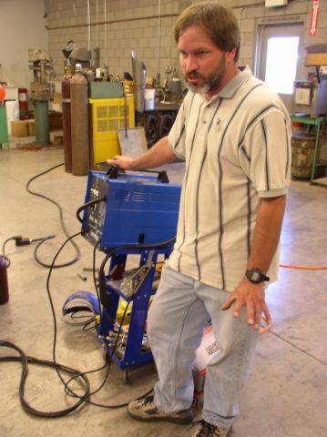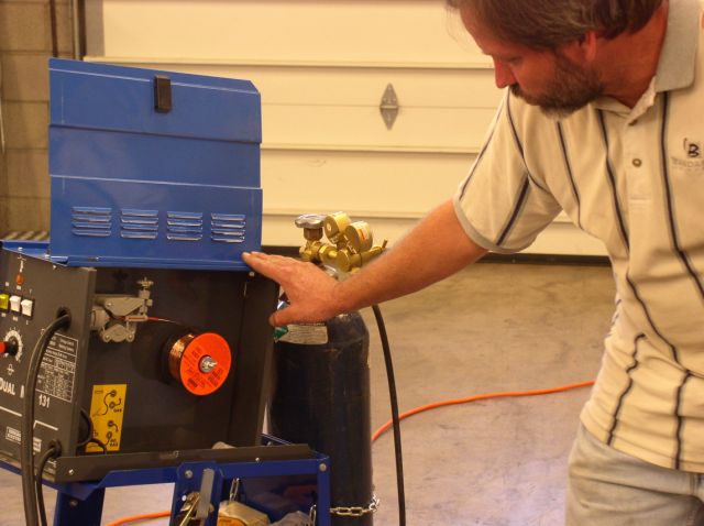 The demonstration of the gas shielded welding used a mixture of 75% Argon and 25% CO2. For welding stainless David recommends 100% Argon or a Tri-Mix gas. David showed several sizes of gas bottles. The smaller ones seem handy at first, but they do not hold enough gas. The refill charge on the smaller tanks and the trouble of transport back & fourth dictate getting a minimum 60 cu ft tank.