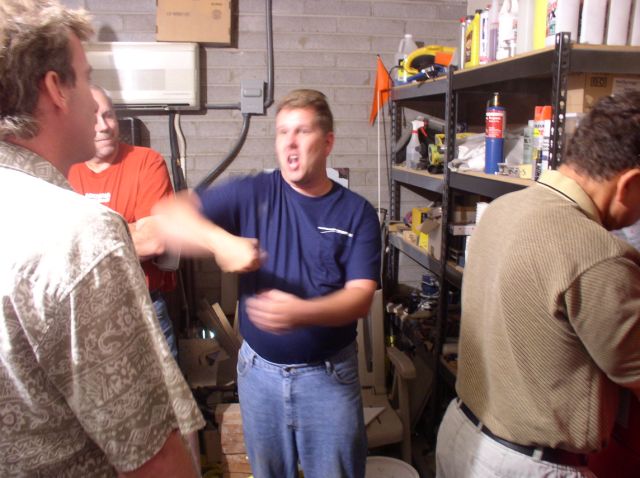 Bart discussing media blasting while a member tries his hand at the cabinet blaster.