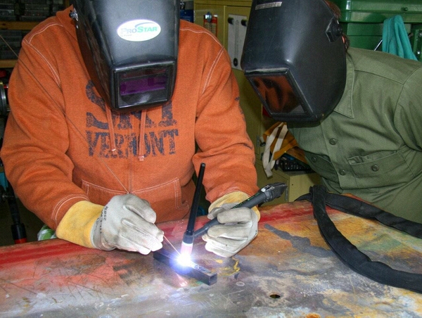 We all look alike dressed for welding. Bob Harbour (green shirt) advises the unknown welder.