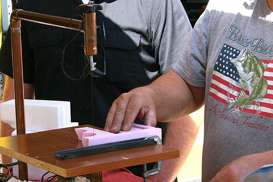 Beevo demonstrates cutting with a rip fence. Very nice strips of foam can be made this way.