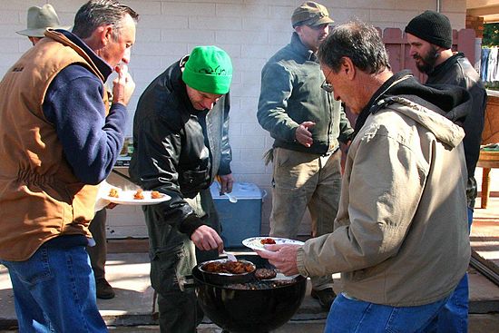 Everybody digs in for the burgers and dogs.