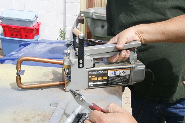Beevo demonstrating the 220V Harbor Freight spot welder. If you ever purchase one of these replace the upper jaw pivot bolt with a smooth shanked bolt!