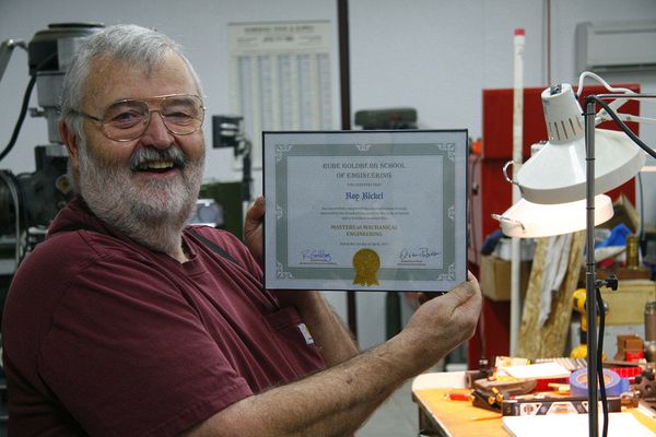 Roy shows off his recently acquired degree in "Machanical Engineering". It was up and on the wall almost immediately!