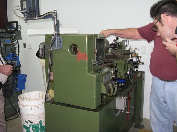 Roy discussing his lathe, new member Joe McDonough looks on.