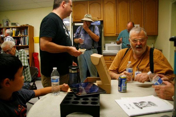 Corey Renner's son supervises the collet rack that Corey (black shirt) made with a 3D printer. Glen Lynch (hat) and Tim Coppage in the background and Roy Rickle in brown shirt.