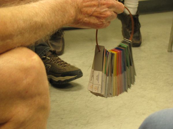 Beevo brought his Columbia Coatings sample swatch set to the meeting. The swatches consist of the Standard colors and the RAL colors. Neil Butterfield (holding the set) is planning on powder coating a newly built engine.