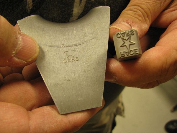 One of the first Star Race Car control arm gussets that Beevo has made from Chrome Moly steel. The test parts were done in 1018 CRS to verify the patterns. Lots of adjustments were made prior to the 4130 stamping test. He has the stamp used to mark the parts that he is making.