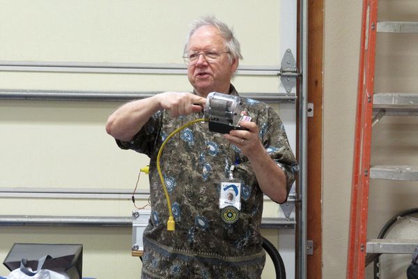 John Herman demonstrating how one would go about magnetizing one's finger with his home brew magnetizer/de-magnetizer.
