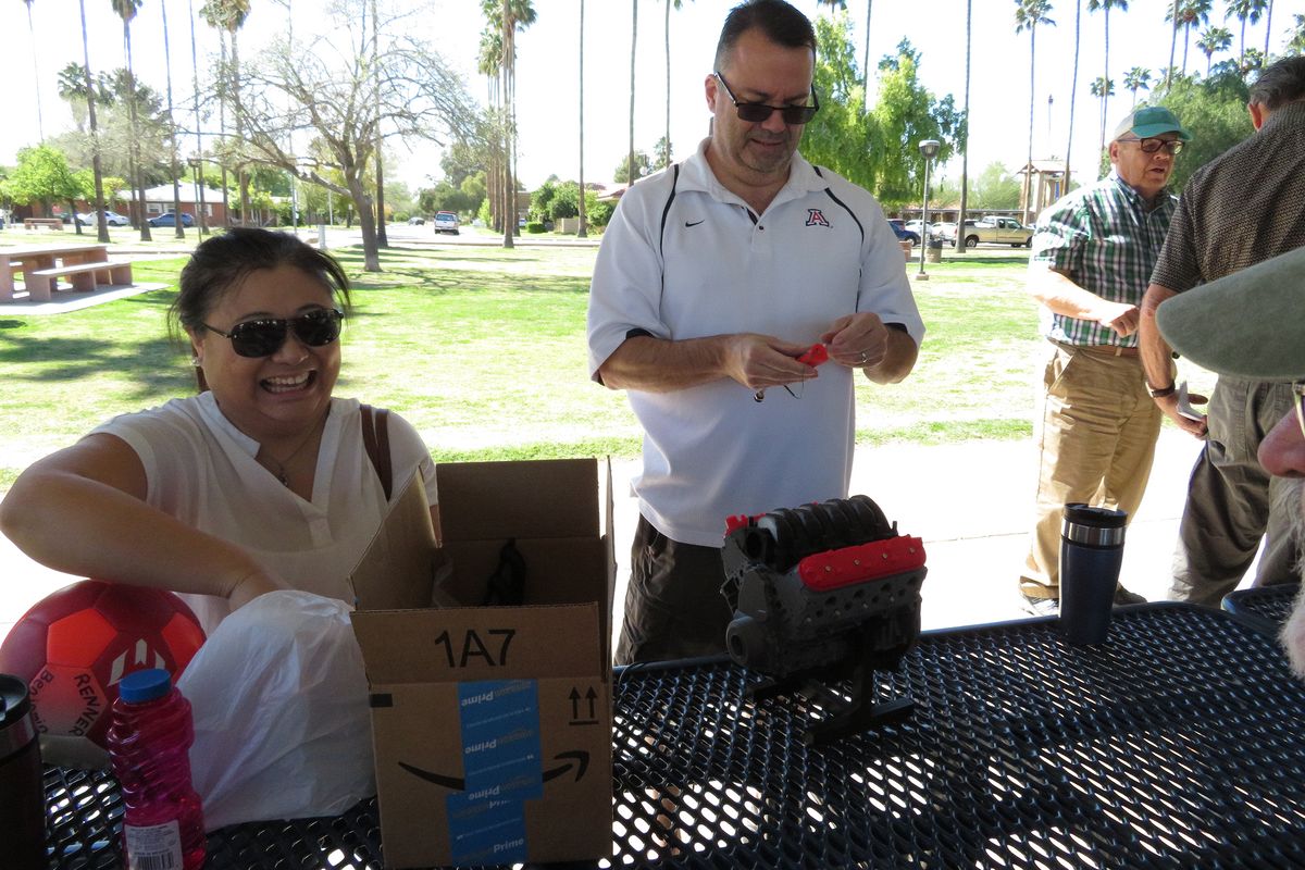 Corey Renner unpacking his 3D printed Chevrolet V8 engine model. It has lots of moving parts and the major components are cleverly held together with magnets.