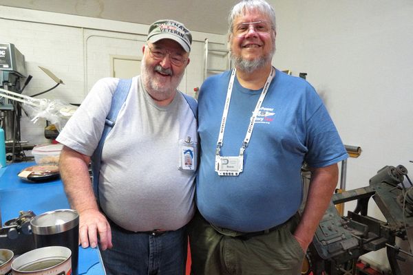 Beevo with his electronic name badge, the badge has an embedded processor, micro SD flash card, digital display and a blinking LED. The images (bitmap) can be paged through with a button push.
