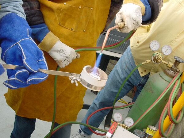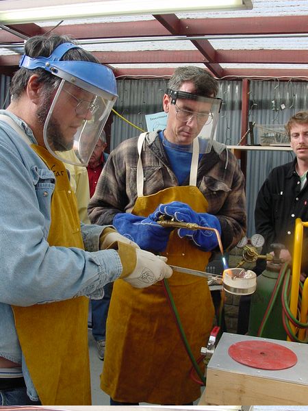 Donning leathers and face masks Tom Haltmeyer (center) heats the silver while Bill VanOrden (left) holds the crucible.