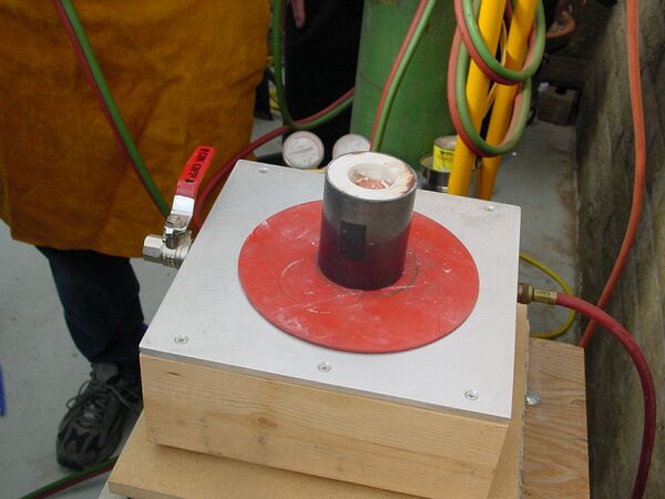 Here is the flask just after pouring the silver, note the slight red glow of the button of metal in the pouring bowl. The flask is set on a vacuum table, the investment is porous enough that the air is sucked through and that draws the molten metal int the various nook and crannies of the mold.