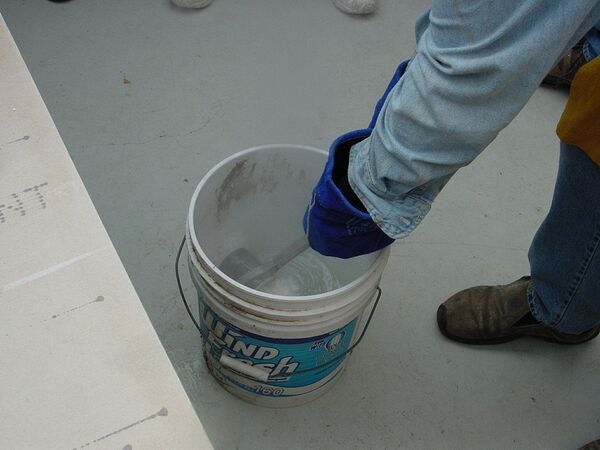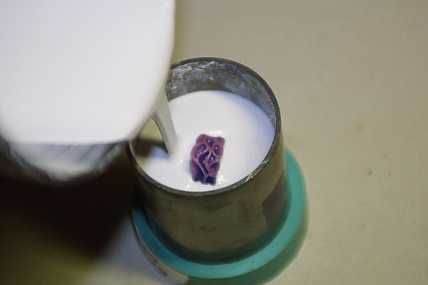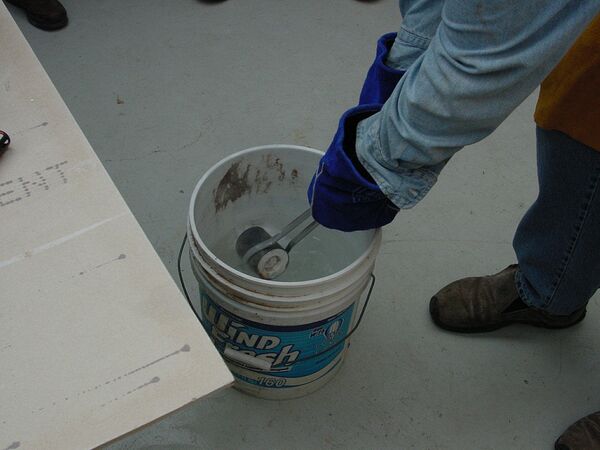 the somewhat cooled, but still very hot, mold is plunged into a bucket of water.