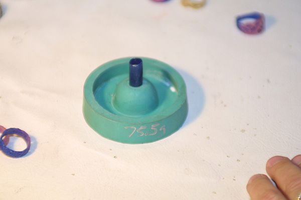 The piece of sprueing wax placed into the rubber flask base. The weight of the base is written on the side. This will come in handy at a later time when you realized you forgot to weight the wax and sprue.