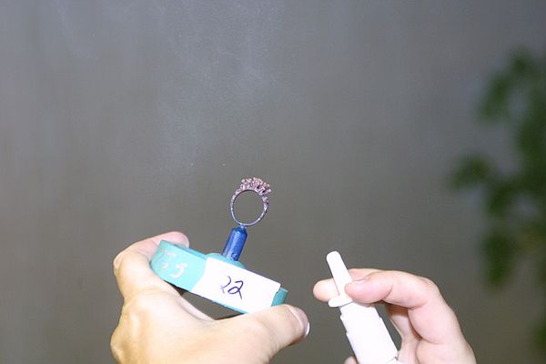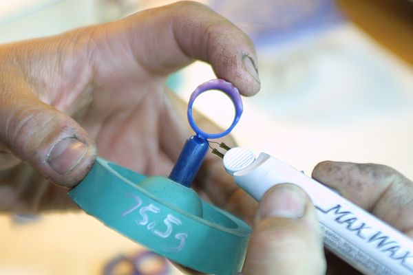 Attaching the ring pattern to the sprue using a wax pen. The wax pen is actually a surgical cauterizing tool.