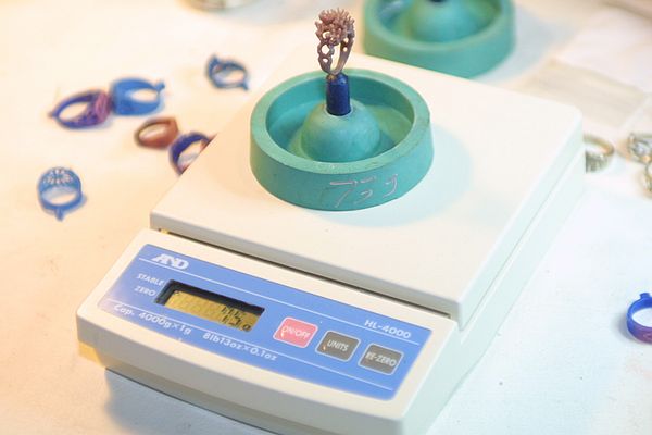 The base and wax is weighed to determine the amount of metal required to fill the mold. The wax portion weighs 2 grams (75g - base).