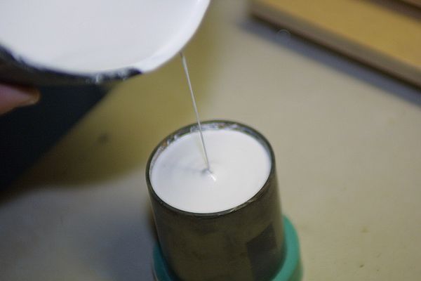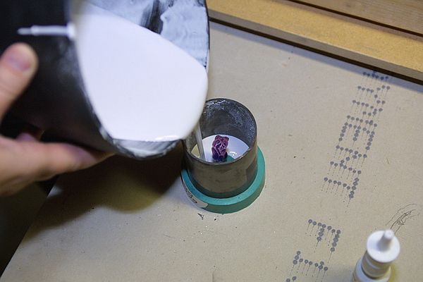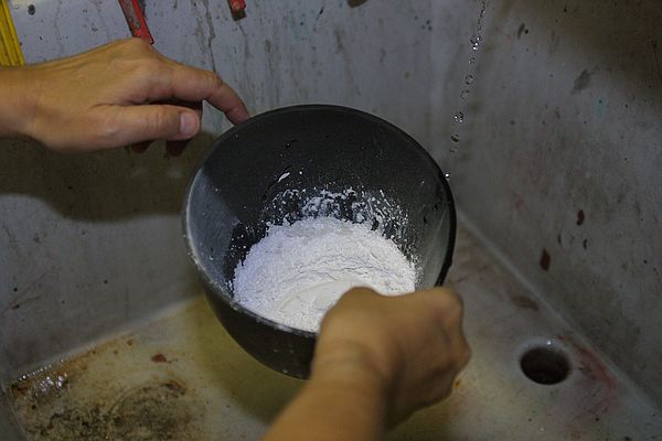 Mixing the investment. Use 1 1/2 times the volume of the empty flask when measuring the powder. Note the very light stream of water being used, it has to be added slowly to prevent over watering the mixture. Use cold water, warm water will greatly speed the setup time.