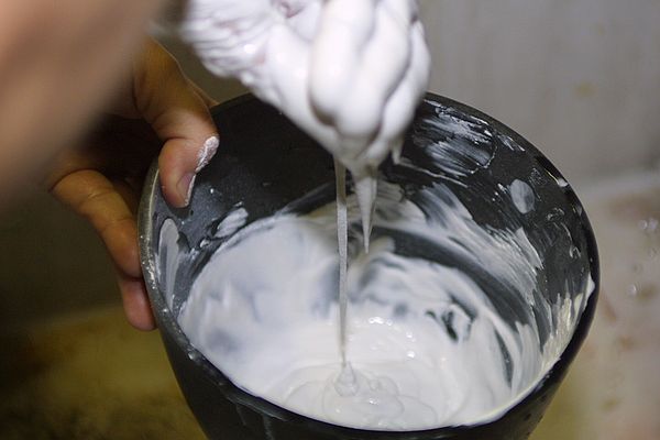 Consistency is checked by dribbling it into the bowl, too thick here! Should have the consistency of watery pancake batter.