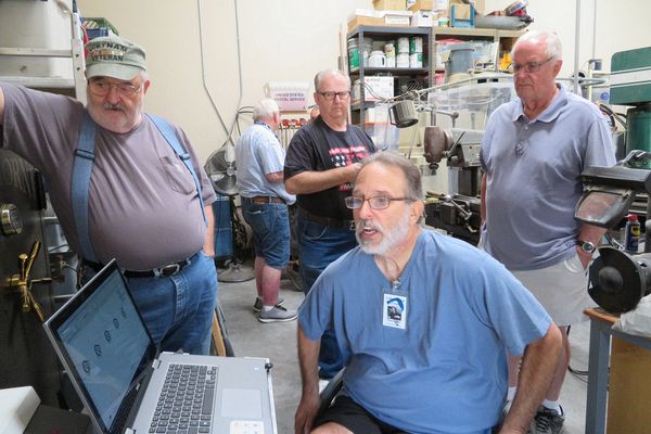 Roy Rickel, John Lea and Wayne Gotthardt watch as Brian explains the operation of the laser.