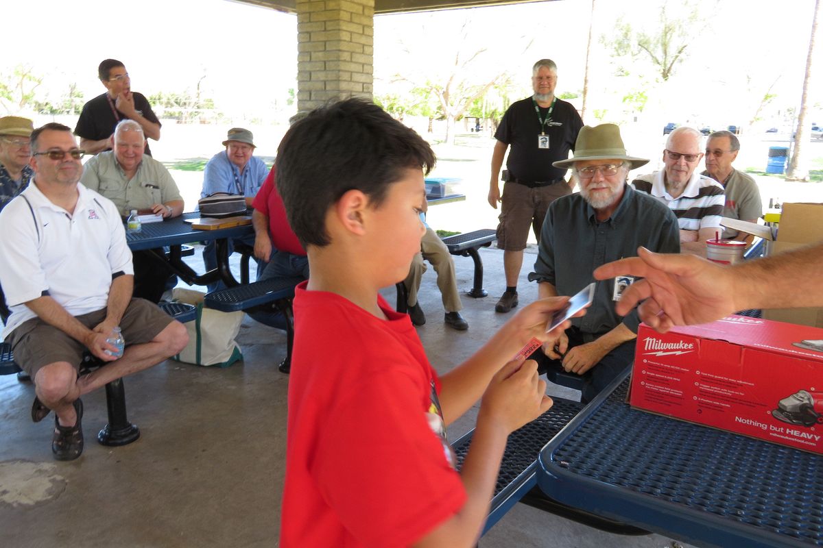 Corey Renner's son accepts Corey's prize of the $50 Industrial Metal Supply gift card