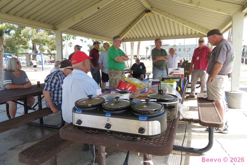 Food waiting to be consumed. Social meeting underway. The weather was beautiful and not terribly warm.